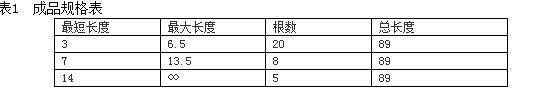 原料按長度分檔,通常以0.5米為一檔,如:3-3.4米按3米計算,3.5米-3.9米按3.5米計算,其余的依此類推。表1是幾種常 見成品的規(guī)格,長度單位為米,∞表示沒有上限,但實際長度小于26米。