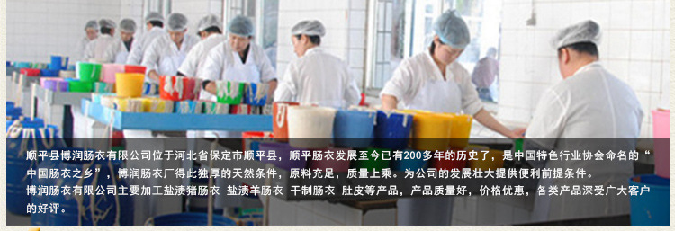 順平縣博潤腸衣有限公司位于河北省保定市順平縣,順平腸衣發(fā)展至今已有200多年的歷史了,是中國特色行業(yè)協(xié)會命名的“中國腸衣之鄉(xiāng)”,博潤腸衣廠得此獨厚的天然條件,原料充足,質(zhì)量上乘。為公司的發(fā)展壯大提供便利前提條件。