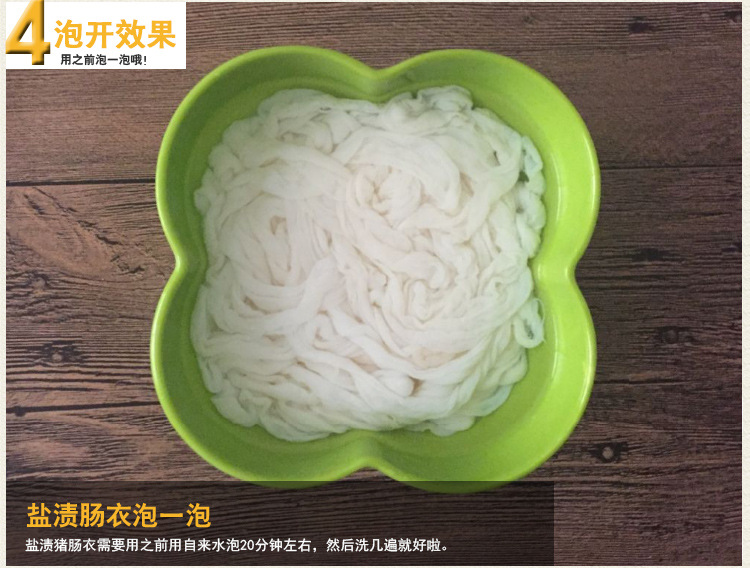 1.鹽漬豬腸衣用冷水(冬天可用溫水)浸泡半小時,再用清水反復(fù)多沖洗幾遍,就可使用(直到?jīng)]有鹽味為止,將鹽洗凈腸衣有韌性,不易破)。