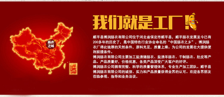 順平縣博潤腸衣有限公司位于河北省保定市順平縣,順平腸衣發(fā)展至今已有200多年的歷史了,是中國特色行業(yè)協(xié)會(huì)命名的“中國腸衣之鄉(xiāng)”,博潤腸衣廠得此獨(dú)厚的天然條件,原料充足,質(zhì)量上乘。為公司的發(fā)展壯大提供便利前提條件。